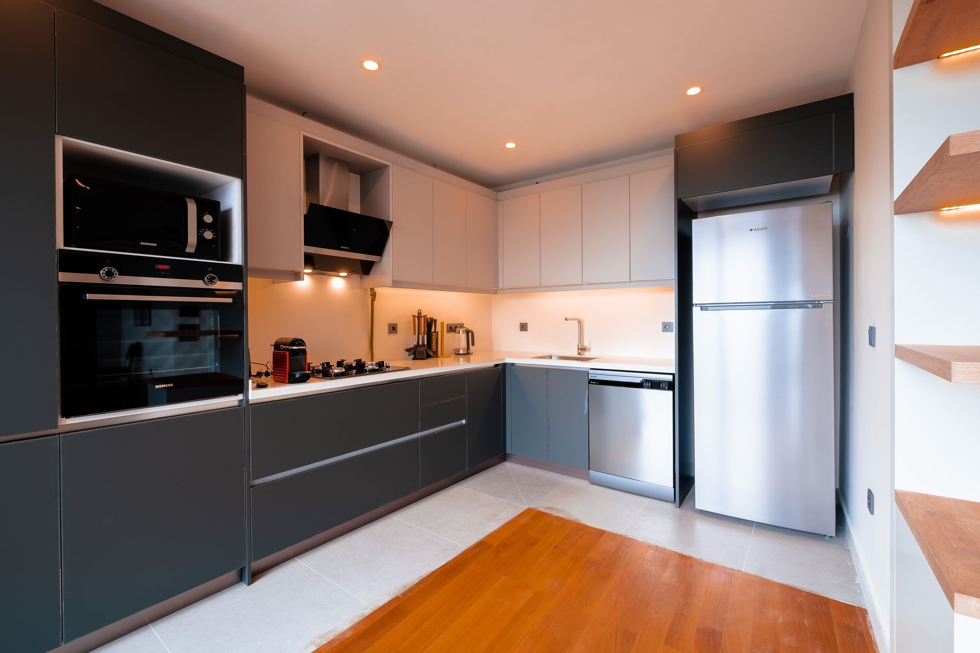 Inside, have a rest on the comfy grey sofa after a busy day in Istanbul.