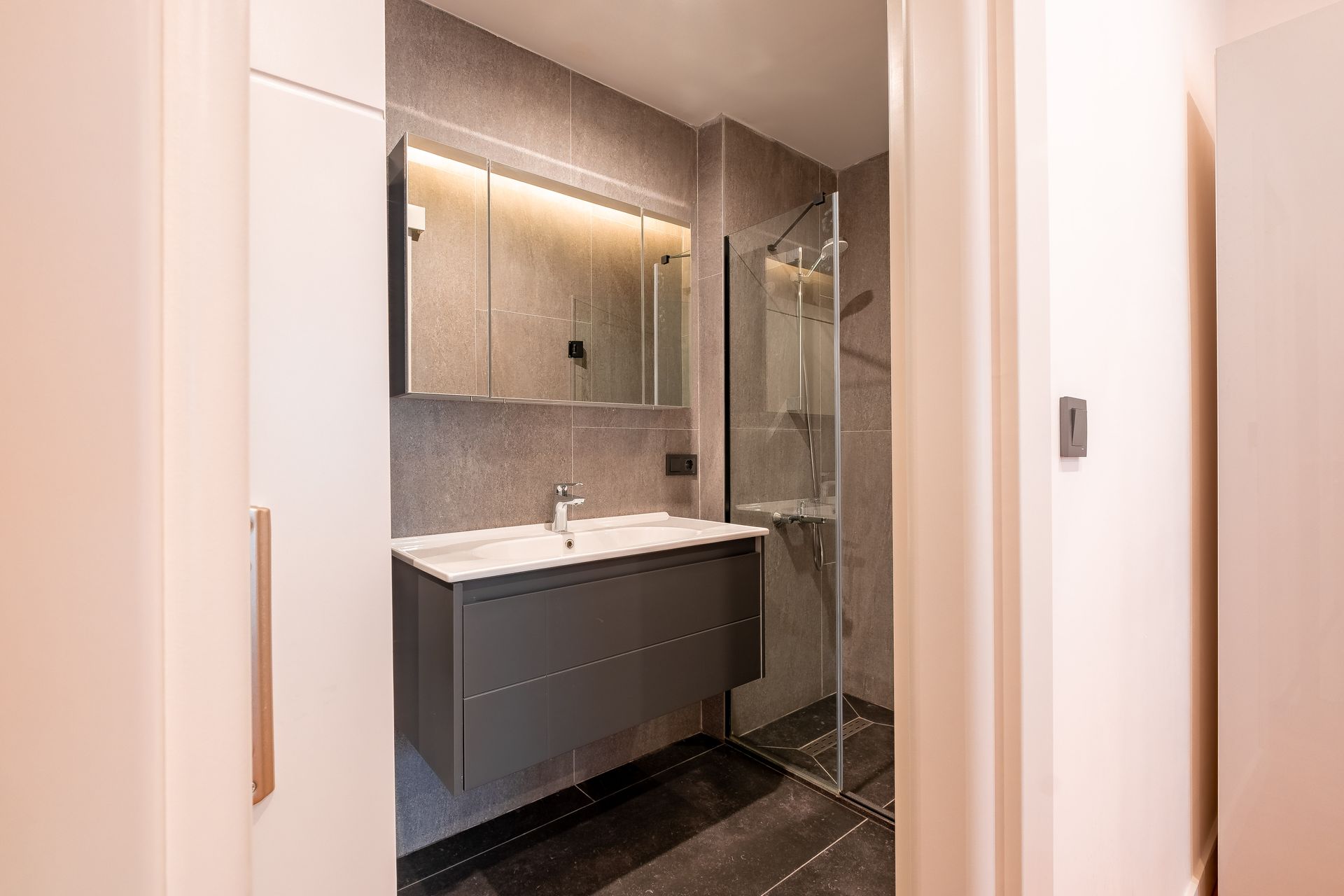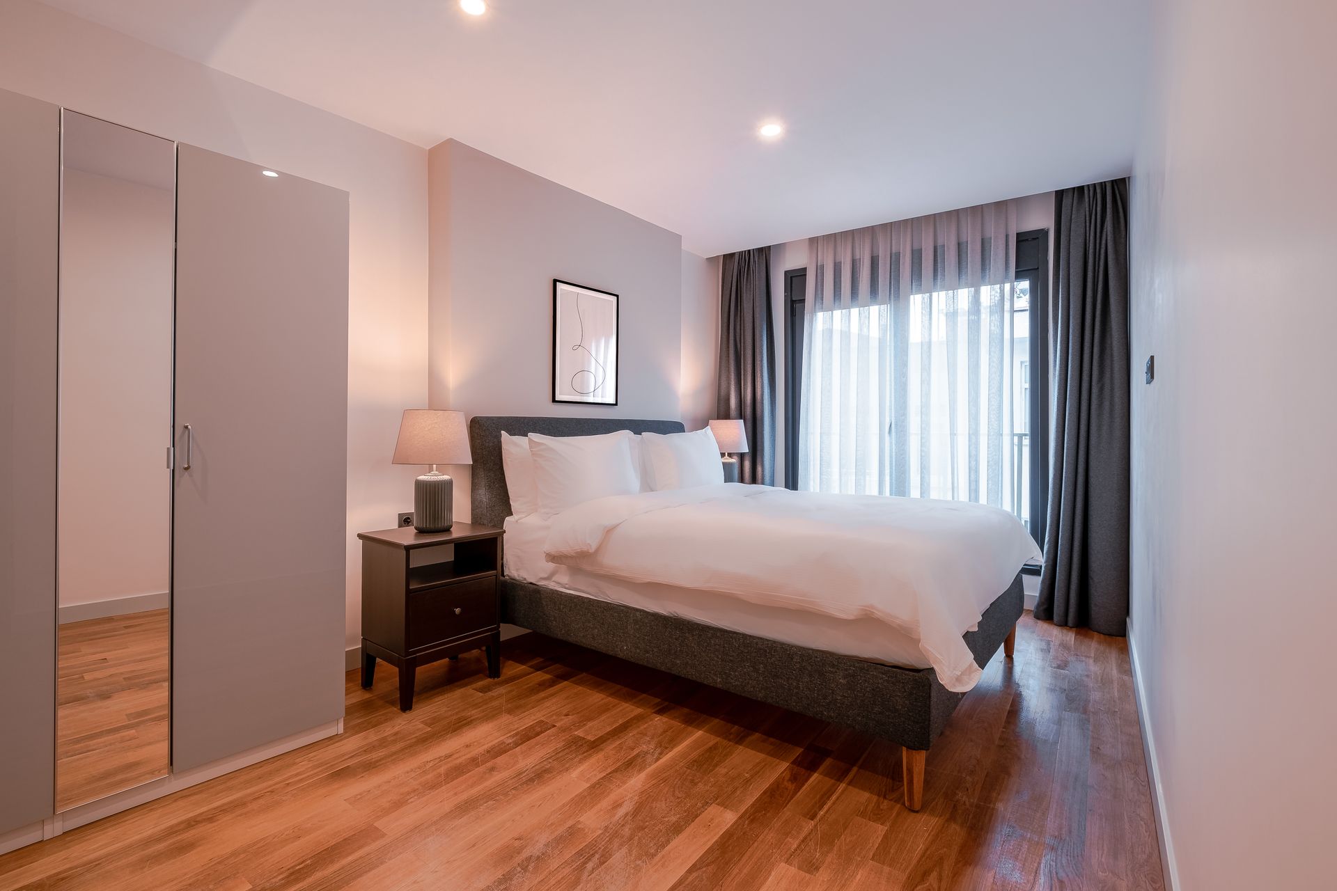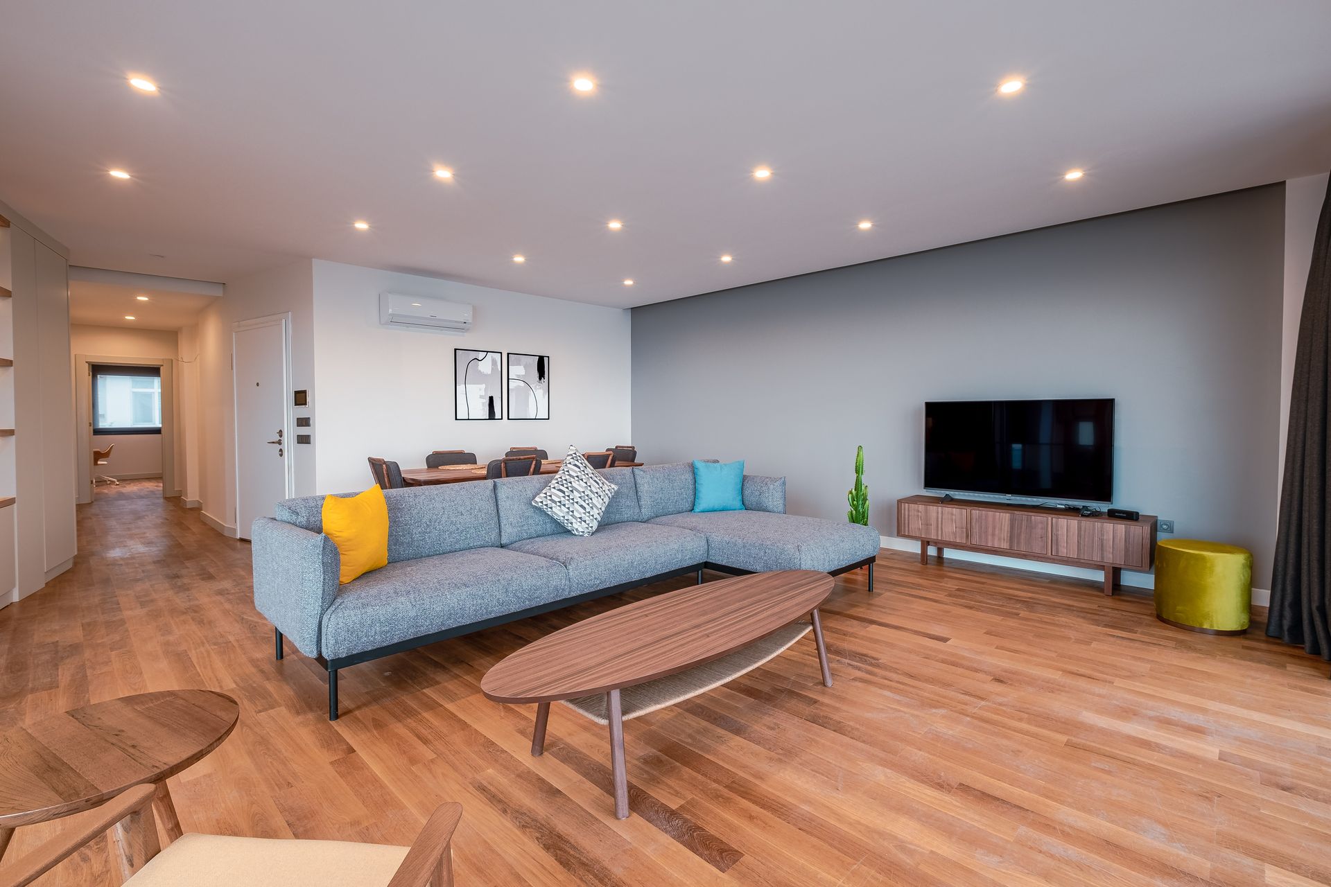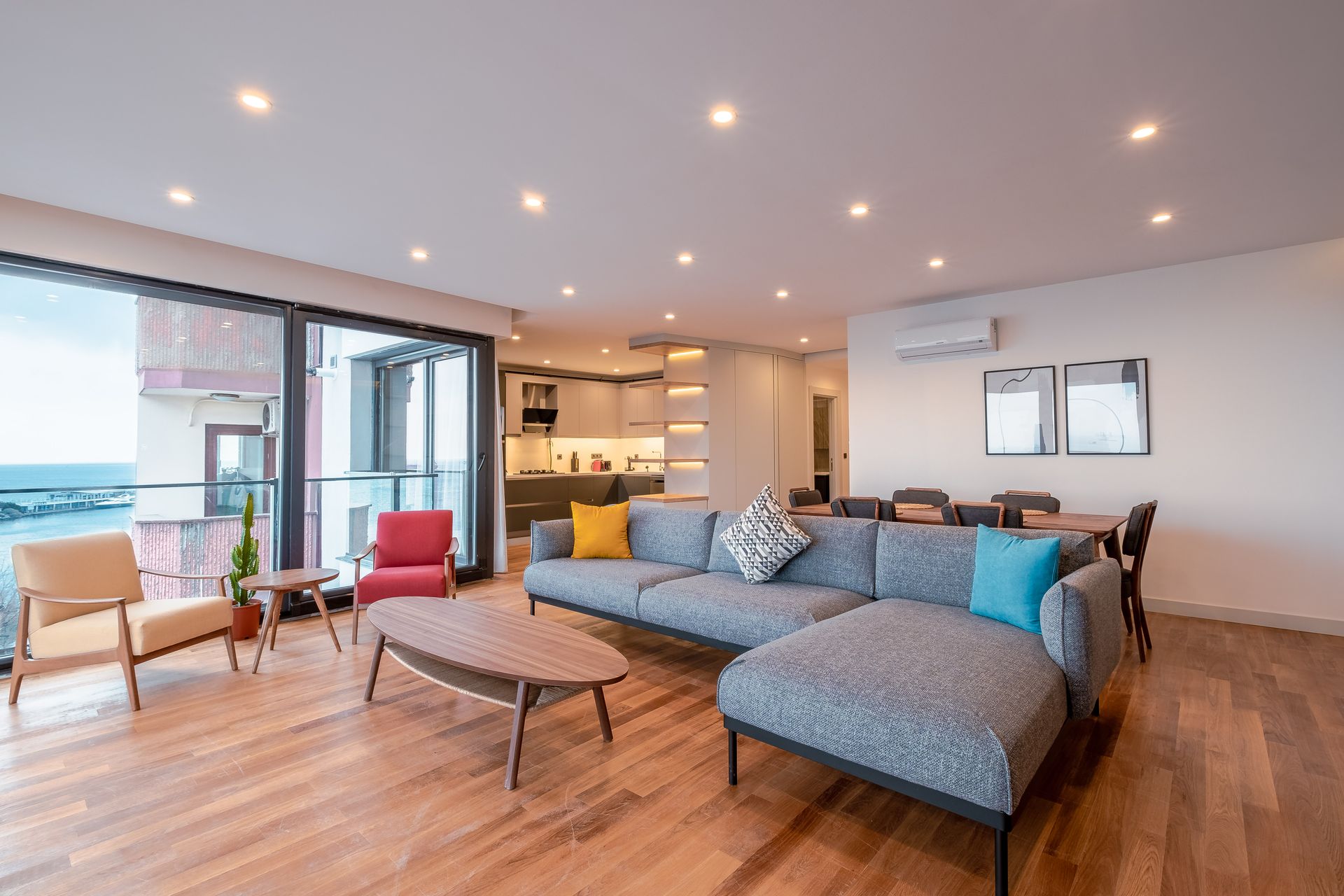 Inside, have a rest on the comfy grey sofa after a busy day in Istanbul.
